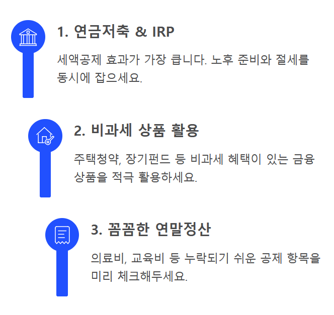 월급이 줄었다면 세금과 보험료를 줄이는 합리적인 방법을 찾아야겠죠. 연금저축, IRP, 비과세 펀드 등으로 절세 효과를 극대화할 수 있습니다. 또한 연말정산 시 공제 항목을 꼼꼼히 챙기면 손실을 줄일 수 있습니다.