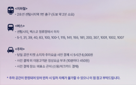 - 🚗 공연장 주변 교통 및 주차 사전 확인